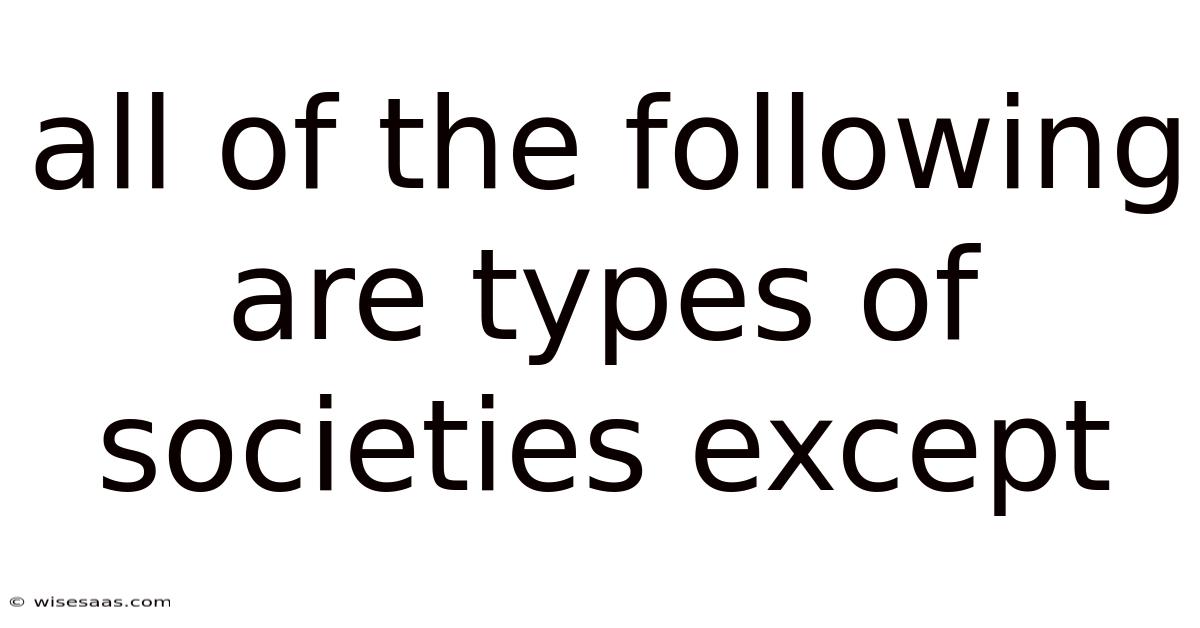 Human societies have been categorized in numerous ways throughout history, primarily based on their primary mode of subsistence, technological complexity, and social organization. These classifications help sociologists and anthropologists trace the evolution of human communities and understand the structural differences that define collective life. In real terms, when encountering a question framed as "all of the following are types of societies except," it tests your knowledge of these established sociological frameworks. And the correct answer is typically a term that describes a political system, a historical period, or a cultural concept rather than a fundamental societal type rooted in economic and social structure. This article will comprehensively explore the standard classifications of human societies, examine modern interpretations, and clearly delineate which common terms are not considered core societal types in academic discourse.