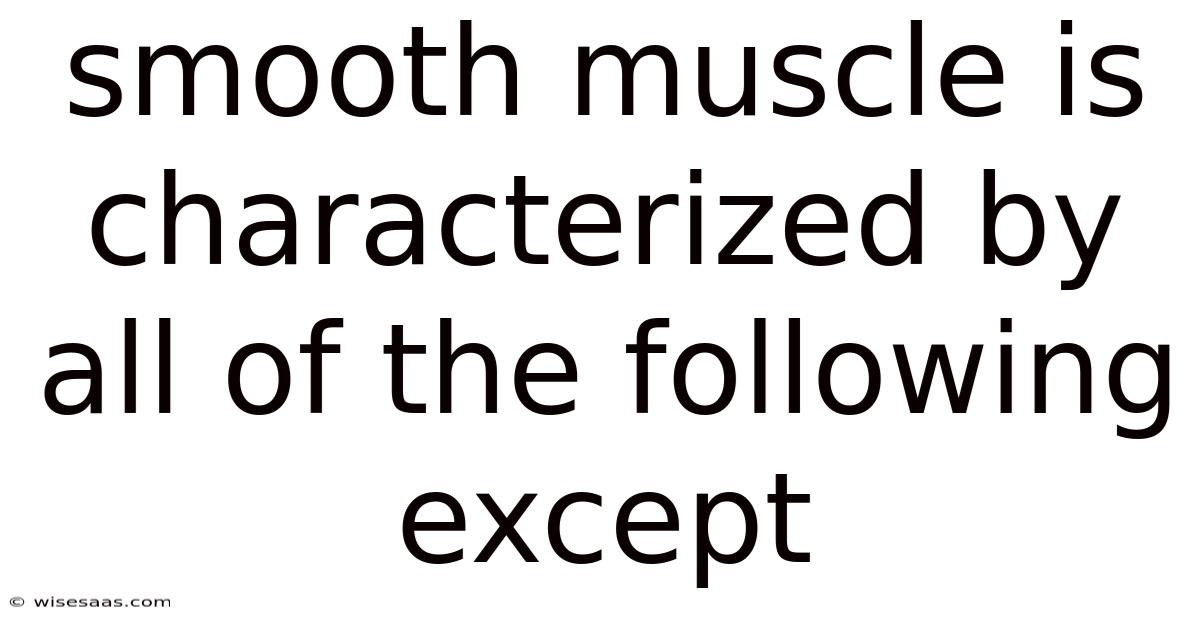 Smooth muscle is characterized by all of the following except striated appearance and voluntary control, a fundamental distinction that sets it apart from skeletal and cardiac muscle tissues. The smooth muscle definition inherently involves its structural and functional adaptations, which enable it to perform critical roles in maintaining homeostasis. In practice, this topic looks at the involved world of involuntary muscle, exploring its unique properties, functions, and biological mechanisms. On the flip side, understanding these characteristics is essential for students, healthcare professionals, and anyone interested in human physiology, as it clarifies how the body regulates internal processes without conscious effort. By examining what smooth muscle is not, we gain a clearer perspective on its specialized design for sustained, rhythmic contractions in organs like the intestines, blood vessels, and uterus The details matter here..